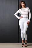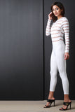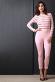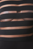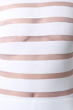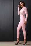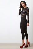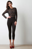 This jumpsuit features semi-sheer with stripe design, round neckline, and long sleeves. Finished with taper cut legs and a back zipper closure. Accessories sold separately. Made in USA. 90% Polyester, 10% Spandex.