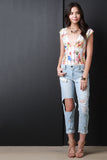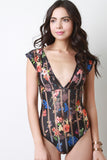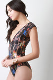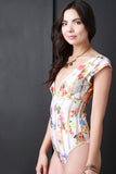 This cute bodysuit features a plunging v-neckline, short sleeve construction and a semi-sheer floral fabrication. Finished with an open back and a double button closure at crotch. Accessories sold separately. Made in U.S.A. 95% Polyester, 5% Spandex.