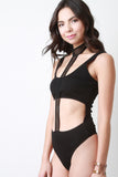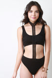 This ribbed knit bodysuit features a scooped neckline and back, a wide panel choker with fishnet design, and a double hook closure at nape. Finished with sleeveless construction, a midriff cutout and double snap button closure at crotch. Accessories sold separately. 100% Cotton.