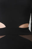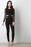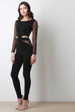 This sexy jumpsuit features smooth stretch knit, contrast semi-sheer mesh, round neckline, midriff cut out design, back zipper closure, and taper cut legs. Accessories sold separately. Made in U.S.A. 70% Polyester, 30% Rayon.