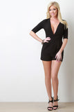 This romper features a textured fabrication, plunging v-neckline, short sleeves, and shorts bottom half. Finished with seams throughout and an open back with a single button closure at nape. Accessories sold separately. Made in U.S.A. 94% Polyester, 6% Spandex.
