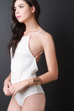 This bodysuit features a stripe mesh fabrication, open back, and thin shoulder straps. Finished with a double snap closure at crotch for easy on/off. Accessories sold separately. Made in U.S.A. 97% Polyester, 3% Spandex.