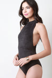 This sleeveless bodysuit features a vegan suede fabrication, mock neckline, and razorback silhoutte. Finished with a double button snap closure at crotch for easy on/off. Accessories sold separately. Made in U.S.A. 90% Polyester, 10% Spandex.