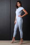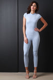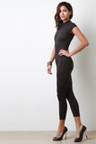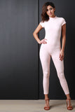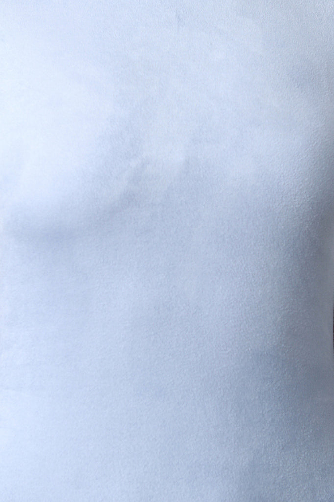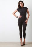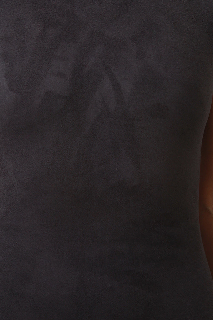 This chic jumpsuit features soft vegan suede, mock neckline, and cap sleeve construction. Finished with a back gold zipper fastener, and taper cut legs. Accessories sold separately. 95% Polyester, 5% Spandex.