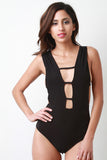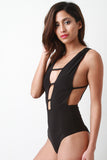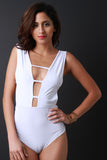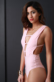 This bodysuit features a plunging v-neckline, soft stretchy knit fabrication, and sleeveless construction. Finished with front and side straps, cinched shoulder detail and double snap closure at crotch for easy on/off. Accessories sold separately. Made in U.S.A. 94% Polyester, 6% Spandex.
