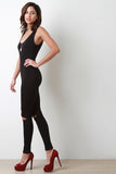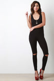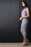 This casual jumpsuit features a jersey knit fabrication, sleeveless construction, scoop neckline, and curve hugging. Finished with slits along knees. Accessories sold separately. Made in U.S.A. 95% Cotton, 5% Lycra.
