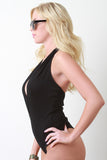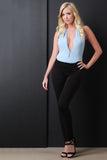 This bodysuit features a deep v-neckline, halter neckline, open back, and smooth stretchy knit fabrication. Finished with a zip-up detail at front and double snap button at crotch. Accessories sold separately. Made in U.S.A. 96% Rayon, 4% Spandex.