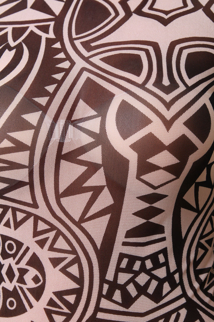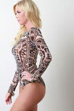 This sheer mesh bodysuit features long sleeves, high rounded neck, and a low cut back. Made in U.S.A. Accessories sold separately. 100% Polyester.