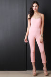 This classic jumpsuit features a textured stretchy knit fabrication, thin lace up back strap closure, and open back construction. Finished with a cinched high waisted seam, and taper cut legs. Accessories sold separately. Made in U.S.A. 95% Polyester, 5% Spandex.