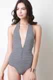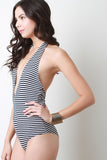 This bodysuit features a striped ribbed knit fabrication, deep v-neckline, and open back construction. Finished with a zip-up front closure and double snap button at crotch Accessories sold separately. Made in U.S.A. 95% Rayon, 5% Spandex.
