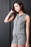 This cute comfy romper features a zipper front for easy access, hoodie back, and sleeveless construction. Finished with a drawstring waist and bodycon shorts. Accessories sold separately. Made in U.S.A. 48% Rayon, 48% Polyester, 4% Spandex.