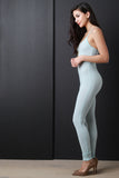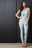 This simple yet comfy jumpsuit features a jersey knit fabrication, scoop neck with spaghetti shoulder straps, sleeveless construction, and taper cut legs. Accessories sold separately. Made in U.S.A. 48% Rayon, 48% Polyester, 4% Spandex.