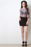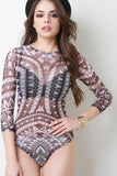 This bodysuit features a tribal print throughout, semi-sheer fabrication, round neckline with single button hook closure at nape. Finished with a quarter sleeve construction and double snap button closure at crotch. Accessories sold separately. Made in U.S.A. 90% Polyester, 10% Spandex.