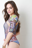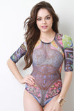 This bodysuit feature a colorful tribal print throughout, semi-sheer fabrication, and round neckline with a single button hook at nape. Finished with a quarter sleeve construction and double snap button closure at crotch. Accessories sold separately. Made in U.S.A. 95% Polyester, 5% Spandex.