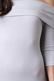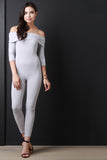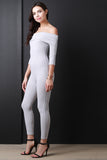This jumpsuit features a ribbed knit fabrication, off shoulder bardot neckline, three quarter sleeves, and figure hugging silhouette. Finished with taper cut legs. Accessories sold separately. Made in U.S.A. 90% Polyester, 10% Spandex.