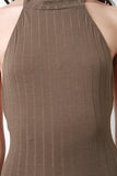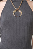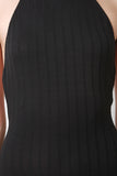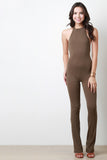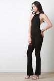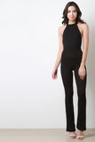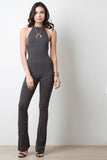 This jumpsuit features a ribbed knit fabrication, halter neckline, and open back construction. Finished with two button hooks at nape, and bell bottom cut legs. Accessories sold separately. Made in U.S.A. 63% Polyester, 32% Rayon, 5% Spandex.