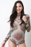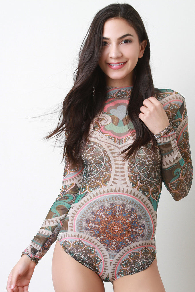 This bodysuit features a semi-sheer sublime mesh fabrication, tribal print throughout, long sleeves construction, and mock neckline. Finished with a double snap button closure at crotch. Accessories sold separately. Made in U.S.A. 100% Polyester.