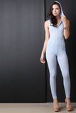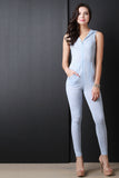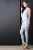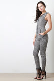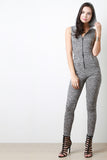 This sporty jumpsuit features a marled ribbed knit fabrication, sleeveless construction, attached hoodie, two front pockets, and front zip-up closure. Finished with taper cut legs. Accessories sold separately. Made in U.S.A. 95% Polyester, 5% Spandex.
