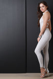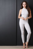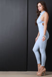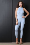 This vegan suede jumpsuit features mock neck, strappy open back, and tapered legs. Accessories sold separately. Made in U.S.A. 90% Polyester, 10% Spandex.