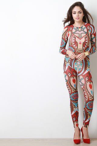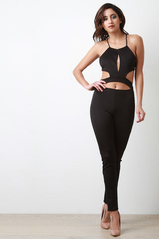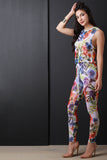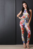 This jumpsuit features a semi-sheer mesh fabrication, vibrant floral print, sleeveless construction, and cinched high waist with self tie drawstring. Finished with taper cut legs and single button hook closure at nape. Accessories sold separately. Made in U.S.A. 95% Polyester, 5% Spandex.