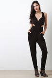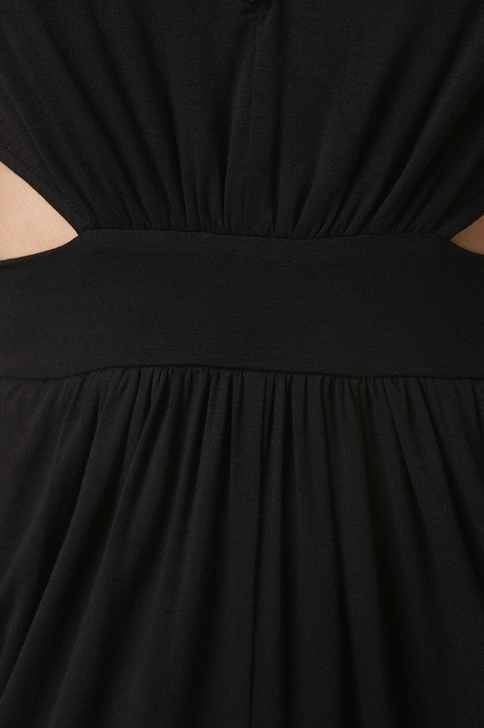 This jumpsuit features soft jersey knit, plunge neck with v-shape boning, ruched detail, open sides, and criss-cross strappy back. Accessories sold separately. Made in U.S.A. 95% Rayon Modal, 5% Spandex.