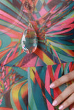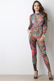 This jumpsuit features a semi-sheer mesh fabrication, colorful abstract print, mock neckline, longsleeve fit, and tapered cut legs. Finished with a hidden rear zip-up closure. Accessories sold separately. Made in U.S.A. 100% Polyester.