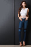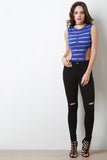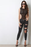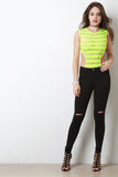 This sexy bodysuit features a semi-sheer stripe mesh fabrication, round neckline, sleeveless construction, and side-to-back cutout design. Finished with a double snap button closure at crotch. Accessories sold separately. Made in U.S.A. 92% Polyester, 8% Spandex.