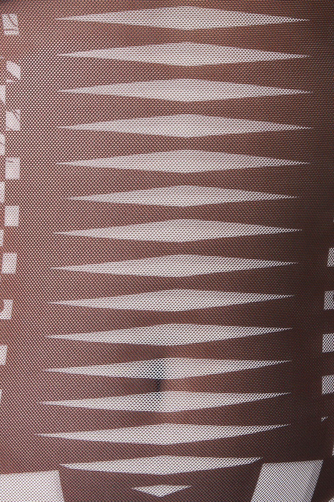 This jumpsuit features semi-sheer mesh, geo print, round neckline, long sleeves, and back cutout with single button closure. Accessories sold separately. Made in U.S.A. 95% Polyester, 5% Spandex.
