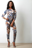 This jumpsuit features a smooth stretchy knit fabrication with leopard print pattern, round neckline, three quarter sleeves, and back keyhole with button hook closure. Finished with taper cut legs. Accessories sold separately. Made in U.S.A. 95% Polyester, 5% Spandex.