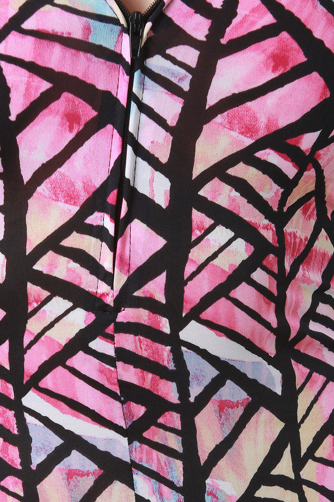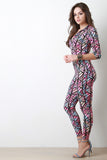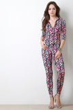 This jumpsuit features colorful geo pattern print, zip-up front, and long sleeves. Accessories sold separately. Made in U.S.A. 95% Polyester, 5% Spandex.