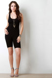 This casual romper features a jersey knit fabrication, scoop neckline, sleeveless fit, racerback, and knee length hemline. Accessories sold separately. Made in U.S.A. 94% Cotton, 6% Spandex.