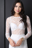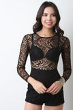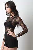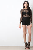 This romper features a semi-sheer mesh fabrication with burn-out pattern, shorts underlay, round neckline, and long sleeves fit. Finished with an exposed rear zip-up closure. Accessories sold separately. Made in U.S.A. 100% Polyester.