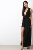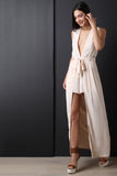 This romper features plunge neckline, self-tie belt, maxi length wrap, partially hidden shorts, and back zipper closure. Accessories sold separately. 94% Polyester, 6% Nylon.