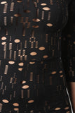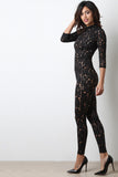 This cutting edge jumpsuit features stretch knit, laser cut perforations, mock neck, long sleeves, and back zipper closure. Accessories sold separately. Made in USA. 86% Polyester. 14% Spandex.