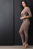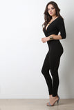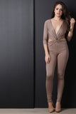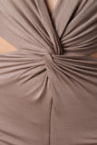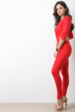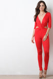 This jumpsuit features a jersey knit fabrication, plunging v-neckline with twisted knot detail at midsection, elbow sleeves, and side-to-back cutout design. Finished with a rear zip-up closure and taper cut legs. Accessories sold separately. Made in U.S.A.