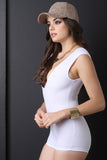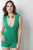 This romper features a texturized knit fabrication, padded wide shoulders, sleeveless fit, and deep v-neckline. Finished with a pleated bottom and rear zipper fastener. Accessories sold separately. Made in U.S.A.