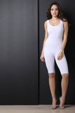 This casual romper features a jersey knit fabrication, scoop neckline and back, sleeveless fit, and knee-length hemline. Accessories sold separately. Made in U.S.A. 100% Rayon.