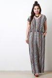 This plus size jumpsuit is casual fitting with wide legs and an elasticized waist. V-neckline and short sleeves bodice, featuring a back keyhole closure. Abstract multi print throughout. Accessories sold separately. Made in U.S.A 95% Rayon. 5% Spandex.