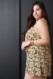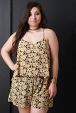 This sleeveless plus size romper features a flowy top tier, adjustable spaghetti shoulder straps, and split back with button accent. Finished with an elasticized waistline and loose fit shorts. Partially lined. Accessories sold separately. 100% Polyester.
