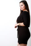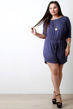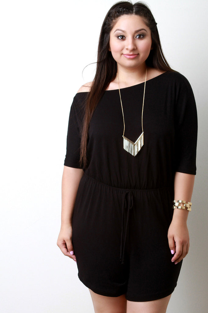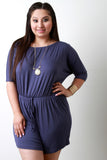 This romper features a jersey knit fabrication, boat neckline, bat wing half sleeves, cinched elasticized waist with faux self-tie drawstring detail. Accessories sold separately. Made in U.S.A. 97% Viscose, 3% Spandex.