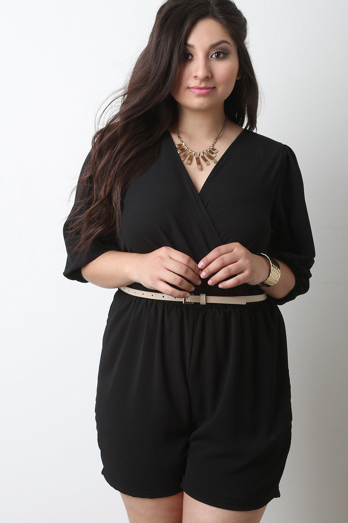 This plus size romper features a textured chiffon fabrication, deep v surplice neckline, three-quarter puff sleeves, and back slits with triple buttons closure. Finished with a cinched waistline, belt loops, and half bottom shorts. Fully lined shorts. Romper include a vegan leather belt. Other accessories sold separately. Made in U.S.A. 100% Polyester.
