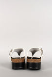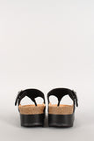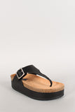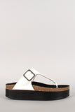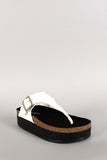 This footbed sandal features a leatherette upper, T-strap thong construction with adjustable buckle, open toe, flat platform heel, molded insole, and an easy slip on style.
