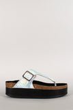 Featuring textured iridescent leatherette upper, T-strap thong construction with adjustable buckle, open toe, flat platform heel, molded insole, and an easy slip on style.