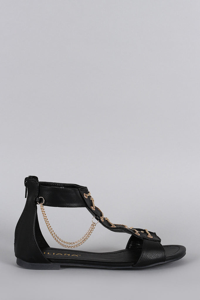 This dangling flat sandal features an open toe , lace up chain design at front vamp, and rear zipper closure for easy on/off. Finished with lightly padded insole for comfort.