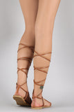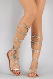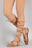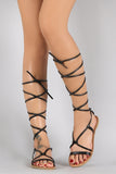 This flat sandal features an open toe silhouette, lightly padded insole, and strappy lace up closure.