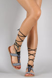 This open toe sandal features a lace-up design, self-tie closure, beadwork embellished center vamp connected to double woven tribal straps, and lightly padded insole for comfort.