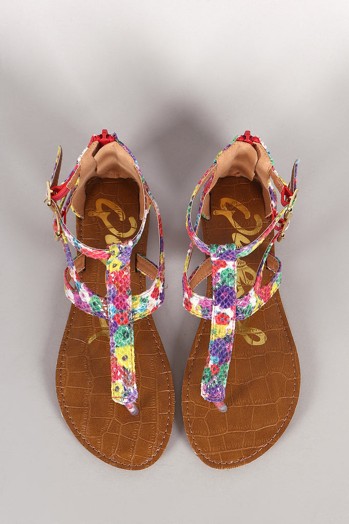 A strappy flat sandal featuring floral print vegan snake leather upper, thong t-strap design with buckle embellishments at the sides, and zip-up enclosed back.