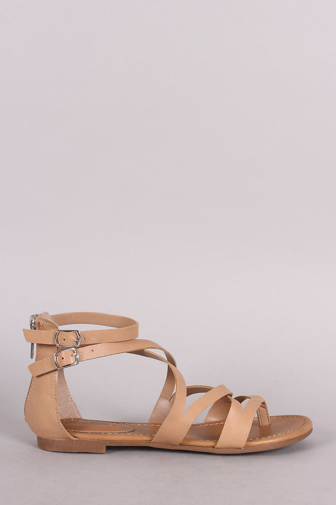 This thong flat sandal features a strappy silhouette, two adjustable buckles accent, lightly padded insole, and rear zipper closure for easy on/off.