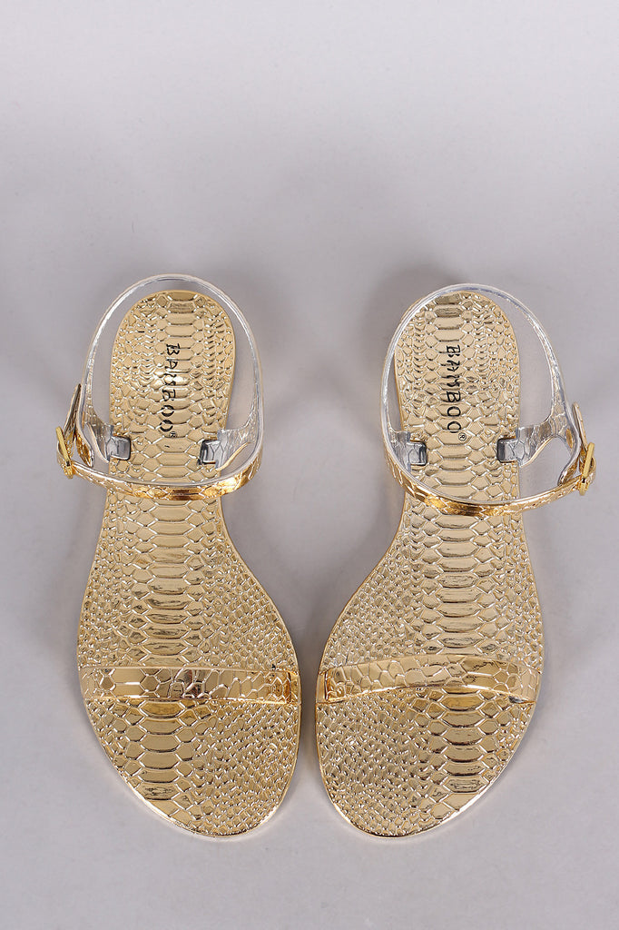 This fashionable jelly throughout, single strap across vamp, and adjustable ankle strap with buckle closure.