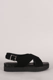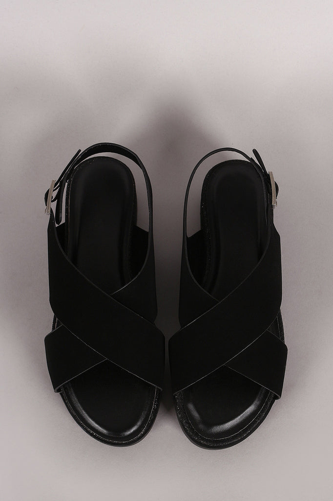 A chunky flat sandal featuring wide crossed straps, an open toe design, and a slingback strap with adjustable buckle closure. Sandal also features a glittery footbed trim, lug sole, and lightly padded insole.